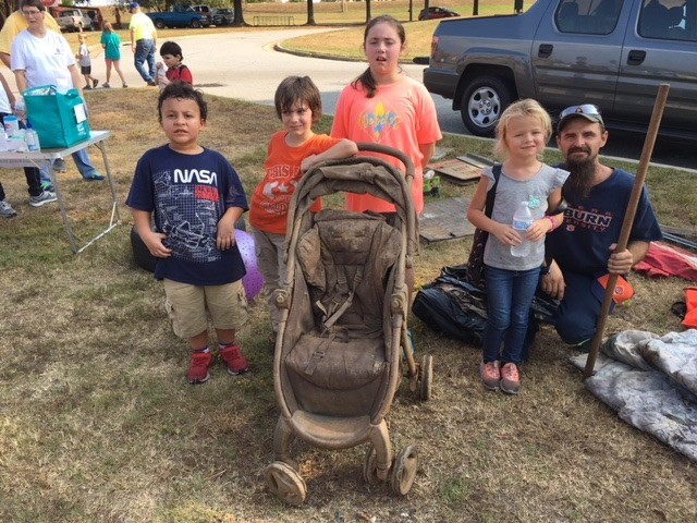 Kids of volunteers showing their trash found in and near the river